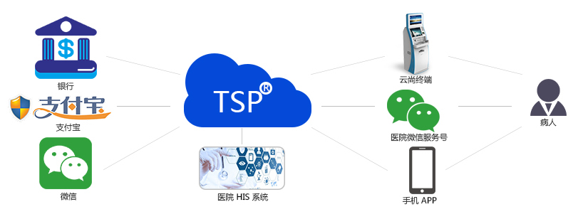 TSP平臺打通了醫(yī)院信息管理系統(tǒng)(HIS)、銀行、微信、支付寶,在支撐就醫(yī)自助終端、微信服務號、手機APP業(yè)務實現(xiàn)的基礎上,還具備終端的遠程運維管理、交易監(jiān)控、消息分發(fā)(微信、短信、郵件、APP)、報表統(tǒng)計、應用管理等功能,為客戶提供全方位的增值化服務。